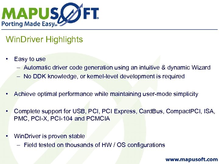 Win. Driver Highlights • Easy to use – Automatic driver code generation using an intuitive & dynamic Wizard – No DDK knowledge, or kernel-level development is required • Achieve optimal performance while maintaining user-mode simplicity • Complete support for USB, PCI Express, Card. Bus, Compact. PCI, ISA, PMC, PCI-X, PCI-104 and PCMCIA • Win. Driver is proven stable – Field tested on thousands of HW / OS configurations