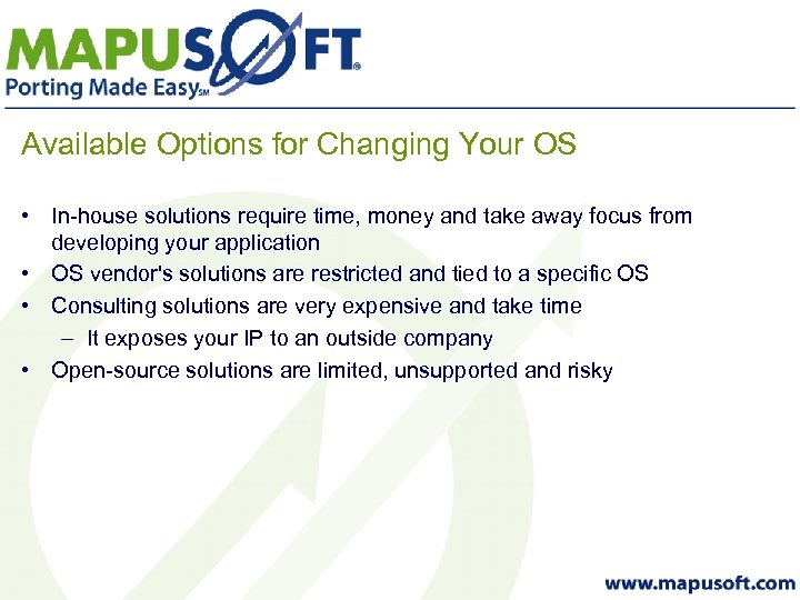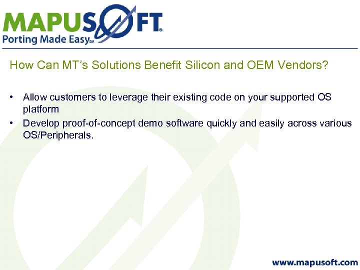 How Can MT’s Solutions Benefit OS Vendors? • Make your customer's transition to your operating system quick and easy • Successful and timely completion of the porting effort ensures a high degree of customer satisfaction leading to repeat business from your customers as well as their downstream customers
