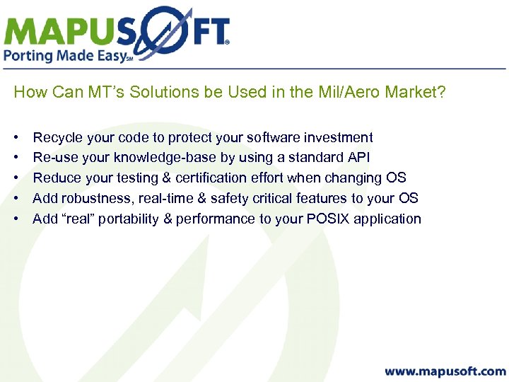 How Can MT’s Solutions be Used in the Mil/Aero Market? • • • Recycle your code to protect your software investment Re-use your knowledge-base by using a standard API Reduce your testing & certification effort when changing OS Add robustness, real-time & safety critical features to your OS Add “real” portability & performance to your POSIX application