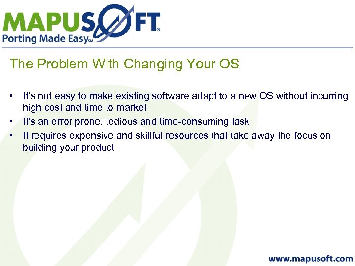 The Problem With Changing Your OS • It’s not easy to make existing software adapt to a new OS without incurring high cost and time to market • It's an error prone, tedious and time-consuming task • It requires expensive and skillful resources that take away the focus on building your product