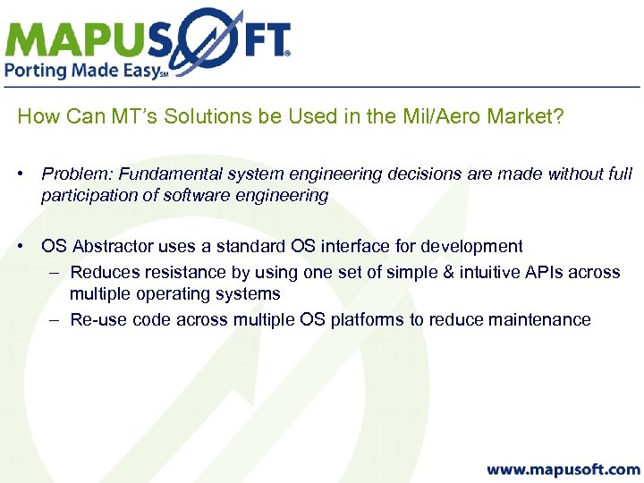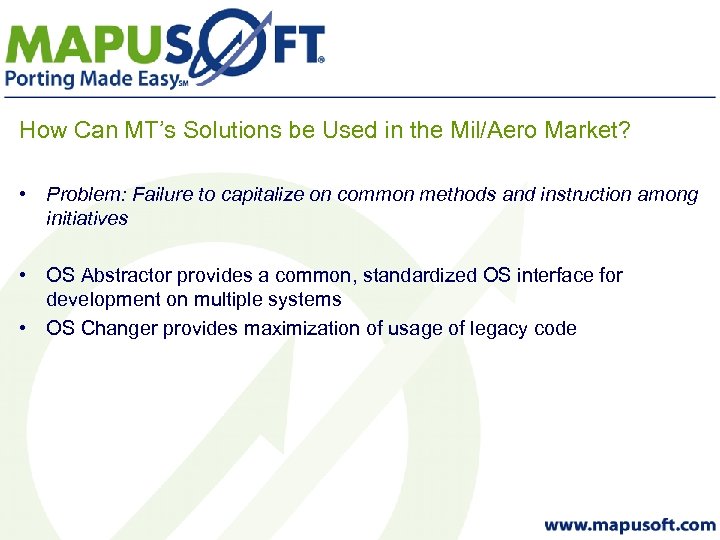 How Can MT’s Solutions be Used in the Mil/Aero Market? • Problem: Failure to capitalize on common methods and instruction among initiatives • OS Abstractor provides a common, standardized OS interface for development on multiple systems • OS Changer provides maximization of usage of legacy code