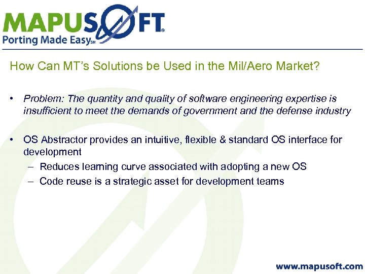How Can MT’s Solutions be Used in the Mil/Aero Market? • Problem: The quantity and quality of software engineering expertise is insufficient to meet the demands of government and the defense industry • OS Abstractor provides an intuitive, flexible & standard OS interface for development – Reduces learning curve associated with adopting a new OS – Code reuse is a strategic asset for development teams