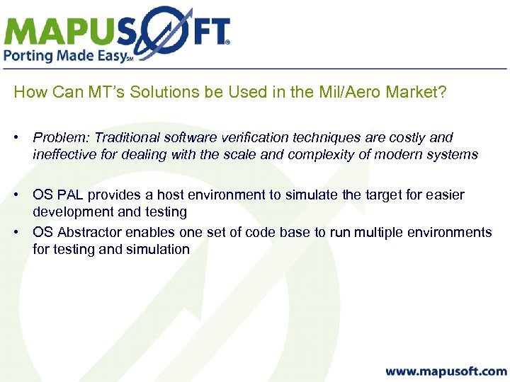 How Can MT’s Solutions be Used in the Mil/Aero Market? • Problem: Traditional software verification techniques are costly and ineffective for dealing with the scale and complexity of modern systems • OS PAL provides a host environment to simulate the target for easier development and testing • OS Abstractor enables one set of code base to run multiple environments for testing and simulation