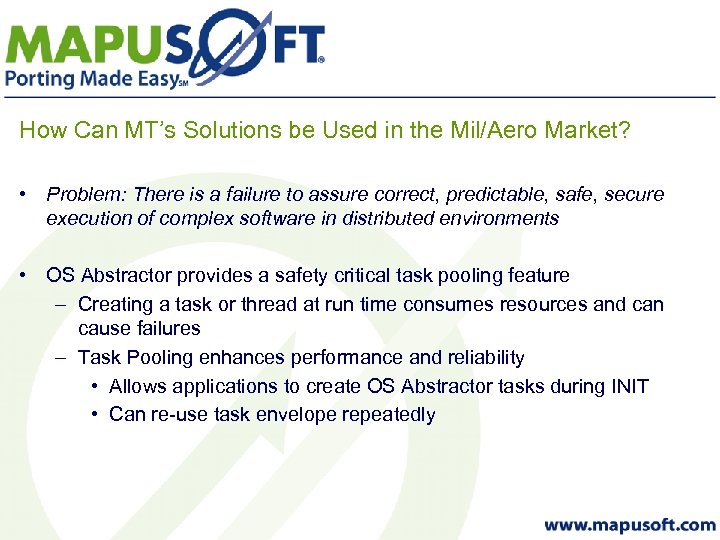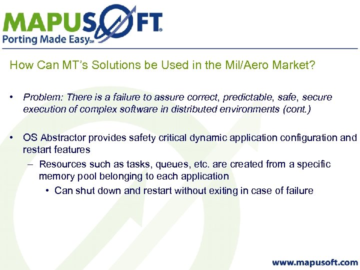 How Can MT’s Solutions be Used in the Mil/Aero Market? • Problem: There is a failure to assure correct, predictable, safe, secure execution of complex software in distributed environments (cont. ) • OS Abstractor provides safety critical dynamic application configuration and restart features – Resources such as tasks, queues, etc. are created from a specific memory pool belonging to each application • Can shut down and restart without exiting in case of failure