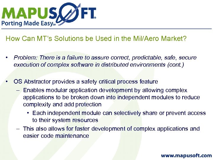 How Can MT’s Solutions be Used in the Mil/Aero Market? • Problem: There is a failure to assure correct, predictable, safe, secure execution of complex software in distributed environments (cont. ) • OS Abstractor provides a safety critical process feature – Enables modular application development by allowing complex applications to be broken down into independent modules to reduce complexity and add protection • Each independent module can selectively share or prevent access to their system resources – This also allows for faster development of complex applications and easier code maintenance