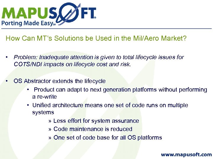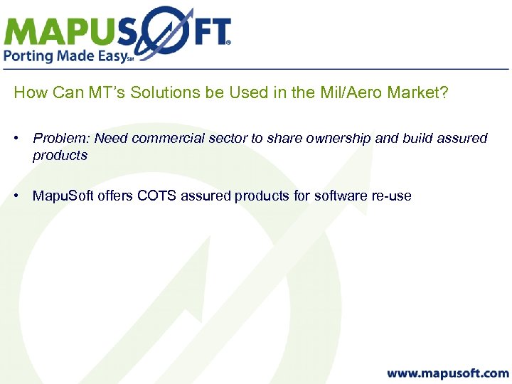 How Can MT’s Solutions be Used in the Mil/Aero Market? • Problem: Need commercial sector to share ownership and build assured products • Mapu. Soft offers COTS assured products for software re-use