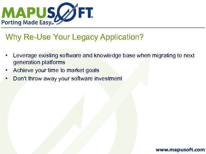 Why Re-Use Your Legacy Application? • Leverage existing software and knowledge base when migrating to next generation platforms • Achieve your time to market goals • Don't throw away your software investment