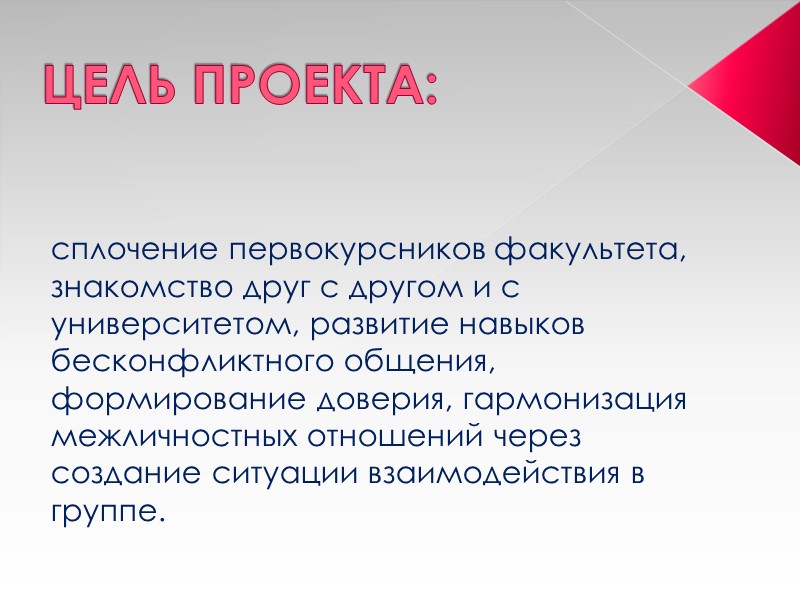 ЦЕЛЬ ПРОЕКТА: сплочение первокурсников факультета, знакомство друг с другом и с университетом, развитие навыков бесконфликтного общения, формирование доверия, гармонизация межличностных отношений через создание ситуации взаимодействия в группе.