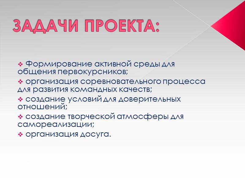 ЗАДАЧИ ПРОЕКТА: Формирование активной среды для общения первокурсников; организация соревновательного процесса для развития командных качеств; создание условий для доверительных отношений; создание творческой атмосферы для самореализации; организация досуга.