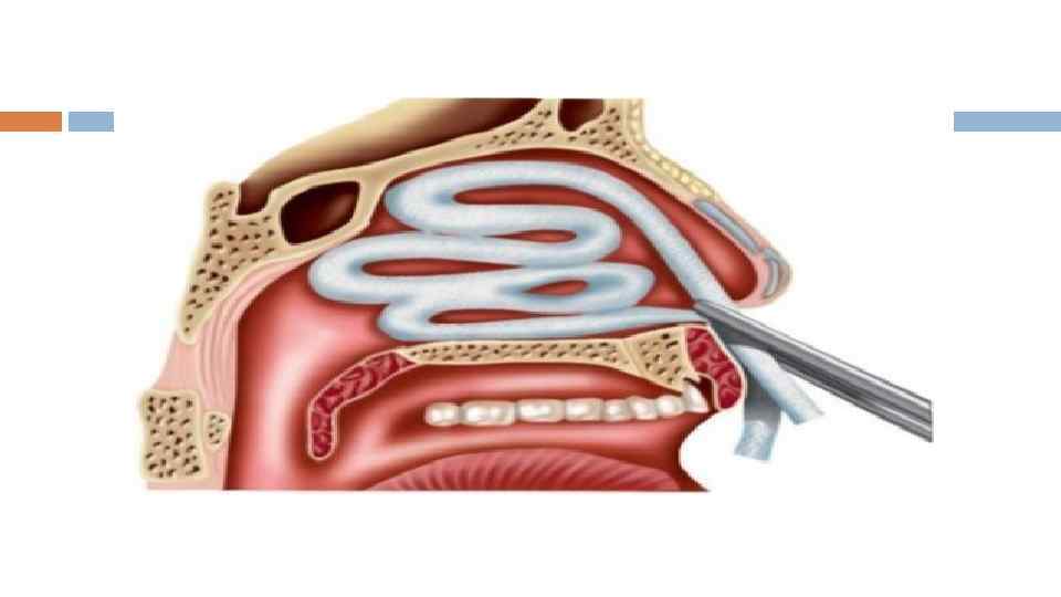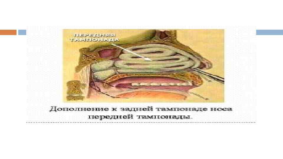 Алдыңғы тампонада Көрсеткіші: гемостатикалық шараларды қолданғанда да қан кету тоқтамаса Қажет құралдар: бүгілмелі пинцет не мұрындық корнцанг, мұрындық кеңейткіш (айна), маңдайлық рефлектор, жалпақтығы 1, 5 см ұзындығы 40 -50 см-лі дәкелі турунда, гемостатикалық және бактерицидті заттар (аминокапрон қышқылы, 5 -10% синтомицин және левомицетин эмульсиясы, дицинон)