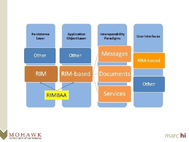 What is MARC-HI? • Mohawk Applied Research Centre in Health Informatics – 3 Faculty Members – 3 Full Time Developers – 6 Course release and co-op students • Began work with HL 7 v 3 in summer 2007 • NSERC operational funding for 2009 -2014 • Focused on building reference implementation of the CHI EHR Infostructure (HL 7 v 3 using p. CS)