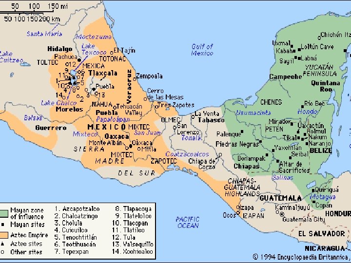 • Mayans: 250 -900 AD, Yucatan, • Guatemala, Belize, ancient towns: Palenque, Chichen Itza. Feather snake, other Deities Writing-hieroglyphs, mathematics, calendar, astronomy Aztecs: military nation coming from the north, 14 cent. AD, capital-Tenochtitlan. Venice of the New World, lake Texcoco(Teškoko) latest King Montezuma II God of the Sun-Huicilopochtilo (vicilopočtlí)-sacrifying of human hearts, blood God of the Feather snake Quetzalcoatl calendar, mathematics astronomy, writing from Mayans