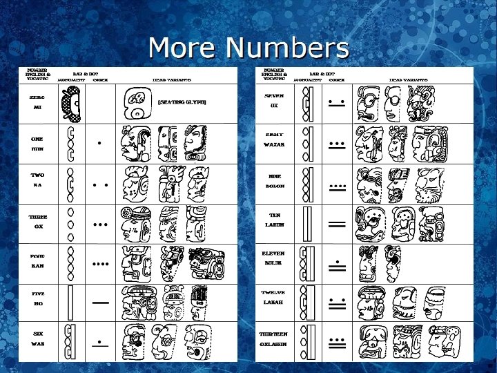 Mayan mathematics v v v Vigesimal number system based on 20 0 – 19 Combination of dots and bars 5 dots replaced by one bar Mayans knew zero