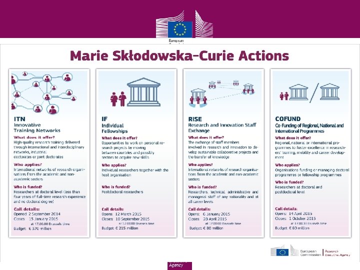 Why? Excellence Training Research Innovation Knowledge Skills Marie Skłodowska-Curie Actions Mobility > € 6. 1 billion in 2014 -2020 Optimum development and dynamic use of Europe’s intellectual capital