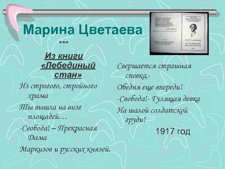 Марина Цветаева *** Из книги «Лебединый стан» Из строгого, стройного храма Ты вышла на визг площадей… -Свобода! – Прекрасная Дама Маркизов и русских князей. Свершается страшная спевка, Обедня еще впереди! -Свобода!- Гулящая девка На шалой солдатской груди! 1917 год