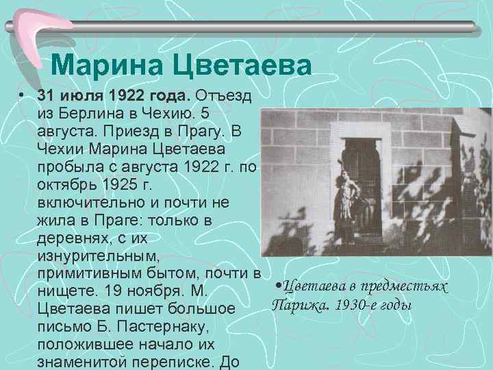 Марина Цветаева • 31 июля 1922 года. Отъезд из Берлина в Чехию. 5 августа. Приезд в Прагу. В Чехии Марина Цветаева пробыла с августа 1922 г. по октябрь 1925 г. включительно и почти не жила в Праге: только в деревнях, с их изнурительным, примитивным бытом, почти в • Цветаева в предместьях нищете. 19 ноября. М. Парижа. 1930 -е годы Цветаева пишет большое письмо Б. Пастернаку, положившее начало их знаменитой переписке. До