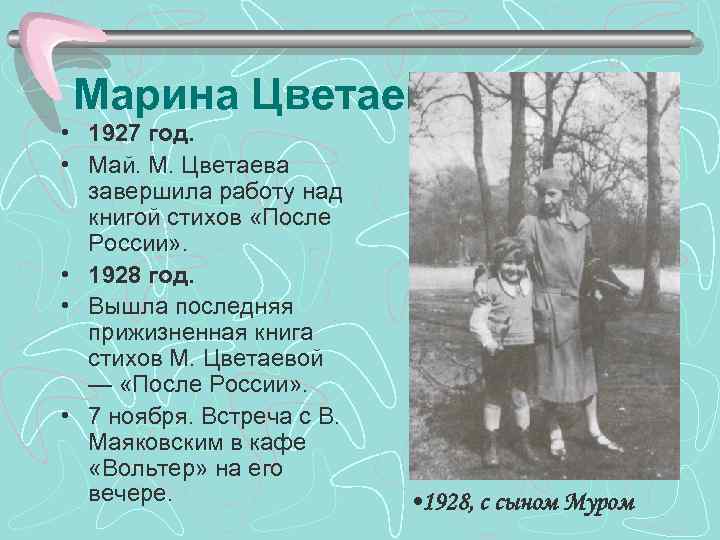 Марина Цветаева • 1927 год. • Май. М. Цветаева завершила работу над книгой стихов «После России» . • 1928 год. • Вышла последняя прижизненная книга стихов М. Цветаевой — «После России» . • 7 ноября. Встреча с В. Маяковским в кафе «Вольтер» на его вечере. • 1928, с сыном Муром
