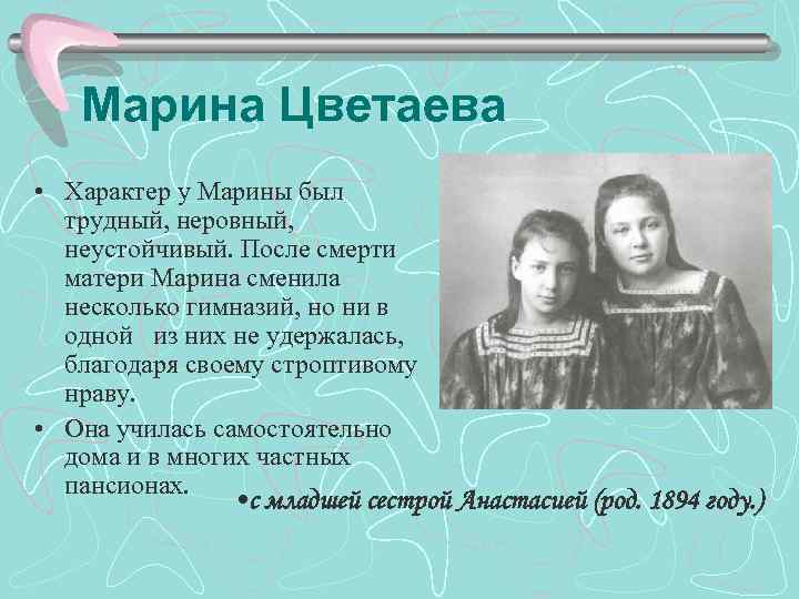 Марина Цветаева • Характер у Марины был трудный, неровный, неустойчивый. После смерти матери Марина сменила несколько гимназий, но ни в одной из них не удержалась, благодаря своему строптивому нраву. • Она училась самостоятельно дома и в многих частных пансионах. • с младшей сестрой Анастасией (род. 1894 году. )