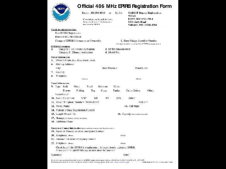 Additional Notes • National Distress Response System (NDRS) VHF based system, coastal and 30 miles out. Digitally based system plus voice Direction finding ability by Coast Guard using multiple towers or GPS input Automated broadcasts Up to six emergency channels RCCs connected to NDRS Completion by end of 2007 or 2008 (hopefully)