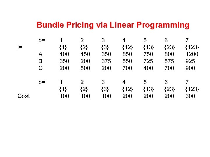 Bundle Pricing via Linear Programming b= i= A B C b= Cost 1 {1} 400 350 200 2 {2} 450 200 500 3 {3} 350 375 200 4 {12} 850 550 700 5 {13} 750 725 400 6 {23} 800 575 700 7 {123} 1200 925 900 1 {1} 100 2 {2} 100 3 {3} 100 4 {12} 200 5 {13} 200 6 {23} 200 7 {123} 300