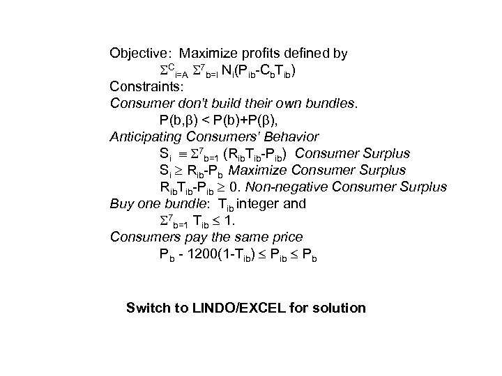 Objective: Maximize profits defined by SCi=A S 7 b=l Ni(Pib-Cb. Tib) Constraints: Consumer don't build their own bundles. P(b, b) < P(b)+P(b), Anticipating Consumers' Behavior Si º S 7 b=1 (Rib. Tib-Pib) Consumer Surplus Si ³ Rib-Pb Maximize Consumer Surplus Rib. Tib-Pib ³ 0. Non-negative Consumer Surplus Buy one bundle: Tib integer and S 7 b=1 Tib £ 1. Consumers pay the same price Pb - 1200(1 -Tib) £ Pib £ Pb Switch to LINDO/EXCEL for solution