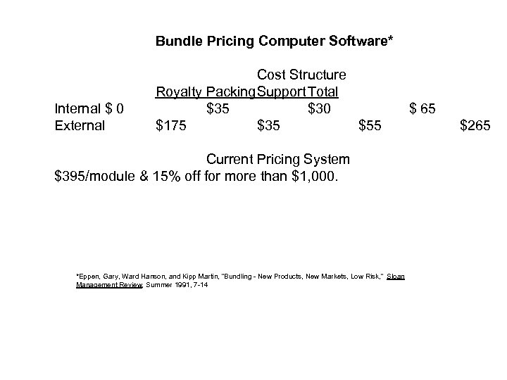Bundle Pricing Computer Software* Internal $ 0 External Cost Structure Royalty Packing. Support. Total $35 $30 $175 $35 $55 Current Pricing System $395/module & 15% off for more than $1, 000. *Eppen, Gary, Ward Hanson, and Kipp Martin, "Bundling - New Products, New Markets, Low Risk, " Sloan Management Review, Summer 1991, 7 -14 $ 65 $265