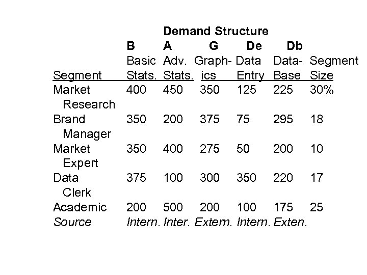 Segment Market Research Brand Manager Market Expert Data Clerk Academic Source Demand Structure B A G De Db Basic Adv. Graph- Data- Segment Stats. ics Entry Base Size 400 450 350 125 225 30% 350 200 375 75 295 18 350 400 275 50 200 10 375 100 350 220 17 200 500 200 175 25 Intern. Inter. Extern. Intern. Exten.