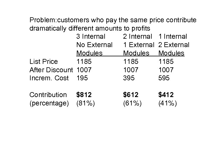 Problem: customers who pay the same price contribute dramatically different amounts to profits 3 Internal 2 Internal 1 Internal No External 1 External 2 External Modules List Price 1185 After Discount 1007 Increm. Cost 195 395 595 Contribution (percentage) $812 (81%) $612 (61%) $412 (41%)