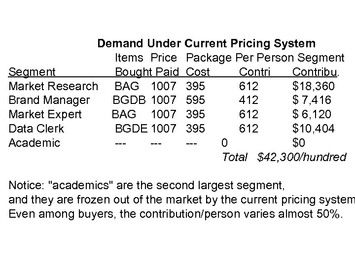 Demand Under Current Pricing System Items Price Package Person Segment Bought Paid Cost Contribu. Market Research BAG 1007 395 612 $18, 360 Brand Manager BGDB 1007 595 412 $ 7, 416 Market Expert BAG 1007 395 612 $ 6, 120 Data Clerk BGDE 1007 395 612 $10, 404 Academic ------0 $0 Total $42, 300/hundred Notice: "academics" are the second largest segment, and they are frozen out of the market by the current pricing system Even among buyers, the contribution/person varies almost 50%.