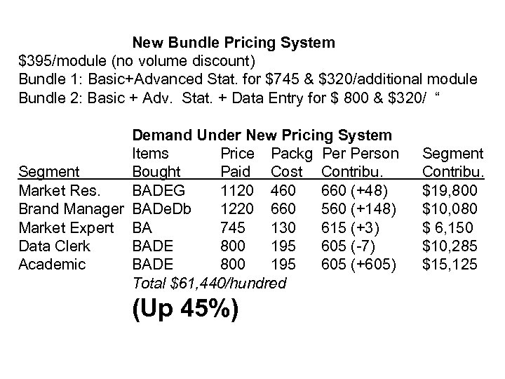 New Bundle Pricing System $395/module (no volume discount) Bundle 1: Basic+Advanced Stat. for $745 & $320/additional module Bundle 2: Basic + Adv. Stat. + Data Entry for $ 800 & $320/ “ Demand Under New Pricing System Items Price Packg Person Segment Bought Paid Cost Contribu. Market Res. BADEG 1120 460 660 (+48) Brand Manager BADe. Db 1220 660 560 (+148) Market Expert BA 745 130 615 (+3) Data Clerk BADE 800 195 605 (-7) Academic BADE 800 195 605 (+605) Total $61, 440/hundred (Up 45%) Segment Contribu. $19, 800 $10, 080 $ 6, 150 $10, 285 $15, 125