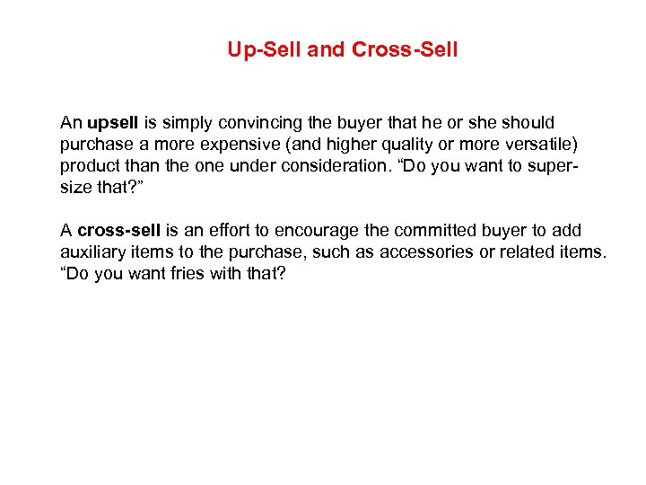 Up-Sell and Cross-Sell An upsell is simply convincing the buyer that he or she should purchase a more expensive (and higher quality or more versatile) product than the one under consideration. “Do you want to supersize that? ” A cross-sell is an effort to encourage the committed buyer to add auxiliary items to the purchase, such as accessories or related items. “Do you want fries with that?