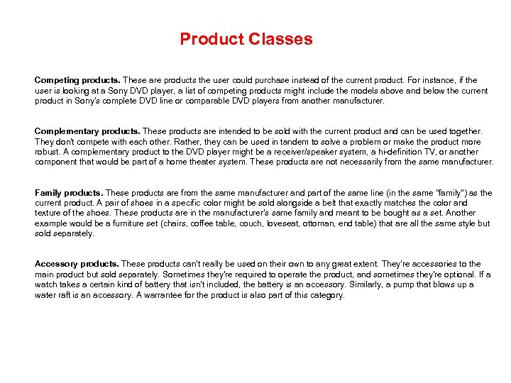 Product Classes Competing products. These are products the user could purchase instead of the current product. For instance, if the user is looking at a Sony DVD player, a list of competing products might include the models above and below the current product in Sony's complete DVD line or comparable DVD players from another manufacturer. Complementary products. These products are intended to be sold with the current product and can be used together. They don't compete with each other. Rather, they can be used in tandem to solve a problem or make the product more robust. A complementary product to the DVD player might be a receiver/speaker system, a hi-definition TV, or another component that would be part of a home theater system. These products are not necessarily from the same manufacturer. Family products. These products are from the same manufacturer and part of the same line (in the same "family") as the current product. A pair of shoes in a specific color might be sold alongside a belt that exactly matches the color and texture of the shoes. These products are in the manufacturer's same family and meant to be bought as a set. Another example would be a furniture set (chairs, coffee table, couch, loveseat, ottoman, end table) that are all the same style but sold separately. Accessory products. These products can't really be used on their own to any great extent. They're accessories to the main product but sold separately. Sometimes they're required to operate the product, and sometimes they're optional. If a watch takes a certain kind of battery that isn't included, the battery is an accessory. Similarly, a pump that blows up a water raft is an accessory. A warrantee for the product is also part of this category.