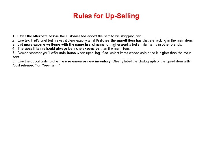 Rules for Up-Selling 1. Offer the alternate before the customer has added the item to his shopping cart. 2. Use text that's brief but makes it clear exactly what features the upsell item has that are lacking in the main item. 3. List more expensive items with the same brand name, or higher quality but similar items in other brands. 4. The upsell item should always be more expensive than the main item. 5. Decide whether you'll offer sale items when upselling. If so, select items whose sale price is higher than the main item. 6. Use the opportunity to offer new releases or new inventory. Clearly label the photograph of the upsell item with "Just released!" or "New Item. "