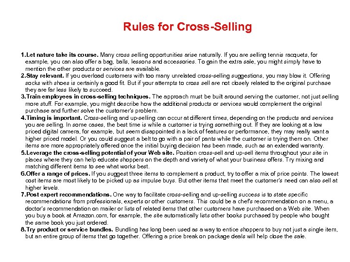 Rules for Cross-Selling 1. Let nature take its course. Many cross selling opportunities arise naturally. If you are selling tennis racquets, for example, you can also offer a bag, balls, lessons and accessories. To gain the extra sale, you might simply have to mention the other products or services are available. 2. Stay relevant. If you overload customers with too many unrelated cross-selling suggestions, you may blow it. Offering socks with shoes is certainly a good fit. But if your attempts to cross sell are not closely related to the original purchase they are far less likely to succeed. 3. Train employees in cross-selling techniques. The approach must be built around serving the customer, not just selling more stuff. For example, you might describe how the additional products or services would complement the original purchase and further solve the customer's problem. 4. Timing is important. Cross-selling and up-selling can occur at different times, depending on the products and services you are selling. In some cases, the best time is while a customer is trying something out. If they are looking at a low priced digital camera, for example, but seem disappointed in a lack of features or performance, they may really want a higher priced model. Or you could suggest a belt to go with a pair of pants while the customer is trying them on. Other items are more appropriately offered once the initial buying decision has been made, such as an extended warranty. 5. Leverage the cross-selling potential of your Web site. Position cross-sell and up-sell items throughout your site in places where they can help educate shoppers on the depth and variety of what your business offers. Try mixing and matching different items to see what works best. 6. Offer a range of prices. If you suggest three items to complement a product, try to offer a mix of price points. The lowest cost items are most likely to be picked up as impulse buys. But other items that meet the customer's need can also sell at higher levels. 7. Post expert recommendations. One way to facilitate cross-selling and up-selling success is to state specific recommendations from professionals, experts or other customers. This could be a chef's recommendation on a menu, a doctor's recommendation on mailer or lists of related items that other customers have purchased on a Web site. When you buy a book at Amazon. com, for example, the site automatically lists other books purchased by people who bought the same book you just ordered. 8. Try product or service bundles. Bundling has long been used as a way to entice shoppers to buy not just a single item, but an entire group of items that go together. Offering a price break on package deals will help close the sale.
