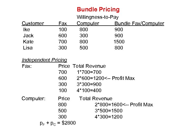 Bundle Pricing Customer Ike Jack Kate Lisa Fax 100 600 700 300 Willingness-to-Pay Computer Bundle Fax/Computer 800 900 300 900 800 1500 800 Independent Pricing Fax: Price Total Revenue 700 1*700=700 600 2*600=1200<-- Profit Max 300 3*300=900 100 4*100=400 Computer: Price Total Revenue 800 2*800=1600<-- Profit Max 500 3*500=1500 300 4*300=1200 p. F + p. C = $2800