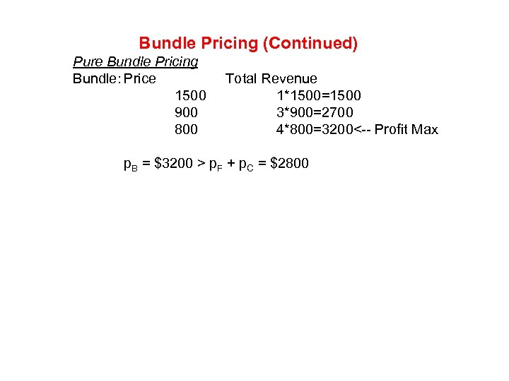 Bundle Pricing (Continued) Pure Bundle Pricing Bundle: Price 1500 900 800 Total Revenue 1*1500=1500 3*900=2700 4*800=3200<-- Profit Max p. B = $3200 > p. F + p. C = $2800