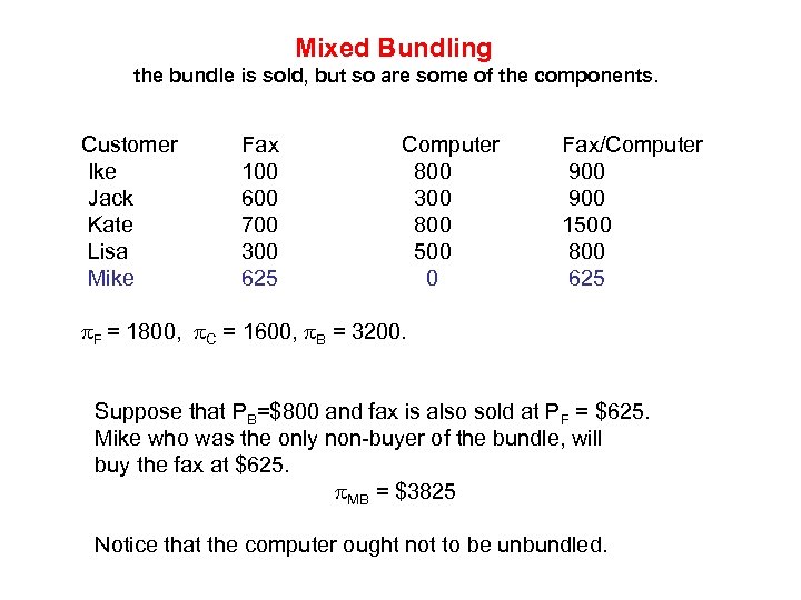 Mixed Bundling the bundle is sold, but so are some of the components. Customer Ike Jack Kate Lisa Mike Fax 100 600 700 300 625 Computer 800 300 800 500 0 Fax/Computer 900 1500 800 625 p. F = 1800, p. C = 1600, p. B = 3200. Suppose that PB=$800 and fax is also sold at PF = $625. Mike who was the only non-buyer of the bundle, will buy the fax at $625. p. MB = $3825 Notice that the computer ought not to be unbundled.