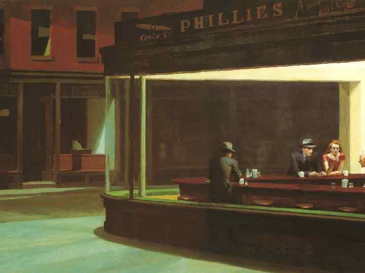 «возможно, бессознательно хотел изобразить одиночество в большом городе» . • сидящие в баре люди, яркий свет кафе, выхватывающий из темноты фрагмент ночного города. Эту картину многие считают символом одиночества и отчуждения людей друг от друга в большом городе