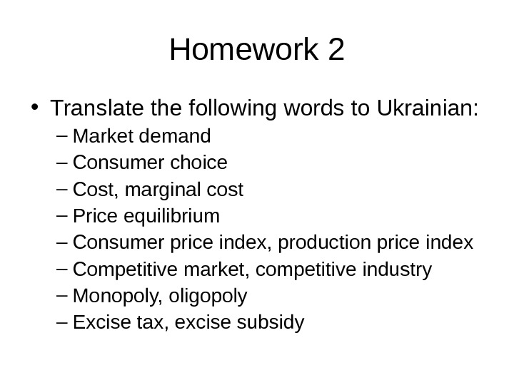 Homework 2 • Translate the following words to Ukrainian: – Market demand – Consumer choice – Cost, marginal cost – Price equilibrium – Consumer price index, production price index – Competitive market, competitive industry – Monopoly, oligopoly – Excise tax, excise subsidy