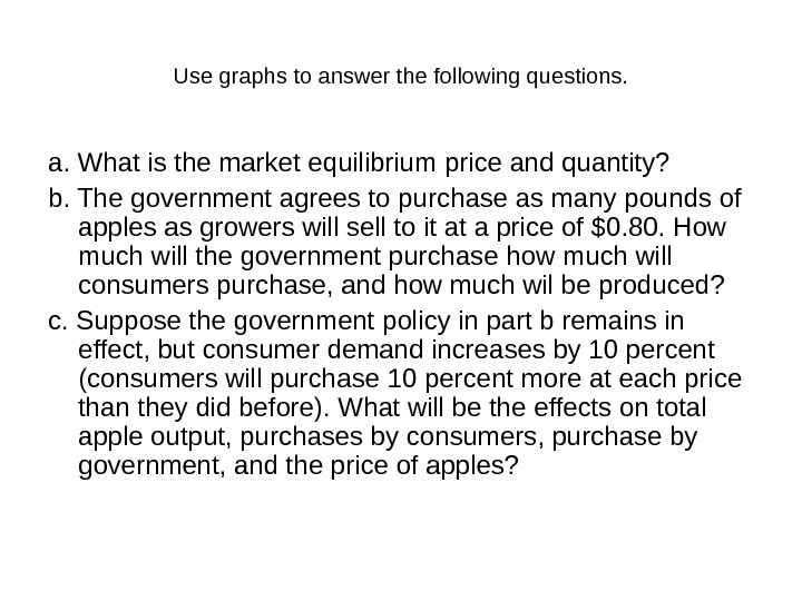 Use graphs to answer the following questions. a. What is the market equilibrium price and quantity? b. The government agrees to purchase as many pounds of apples as growers will sell to it at a price of $0. 80. How much will the government purchase how much will consumers purchase, and how much wil be produced? c. Suppose the government policy in part b remains in effect, but consumer demand increases by 10 percent (consumers will purchase 10 percent more at each price than they did before). What will be the effects on total apple output, purchases by consumers, purchase by government, and the price of apples?