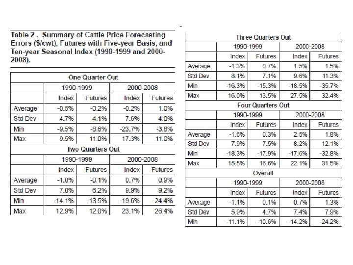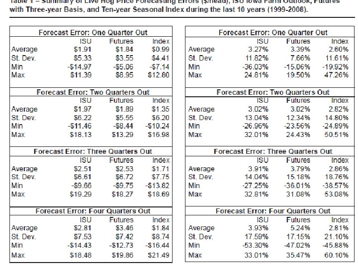 Price Forecast Example for Hogs Hog price in the third quarter one year earlier averaged $70/cwt carcass l Forecast Price = Pf = Pt-1 x (1 + % P) l $70 x (1 + 0. 0985) = $76. 90 l » Point estimate serves as a starting point » There is an error range around the point » Try to account for other factors such as recent demand, exports, farm to retail margins, etc.