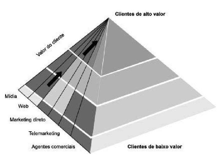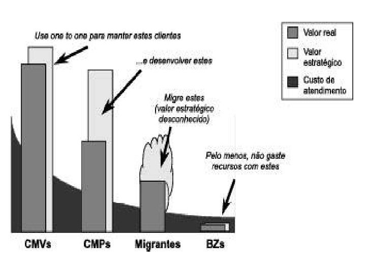 Estratificando seus clientes Com base nos critérios discutidos sobre como implementar iniciativas distintas para os diferentes estratos de clientes, para os CMVs, devemos implementar programas de retenção. Os CMPs necessitam de tratamento distinto. Necessitamos desenvolver esses clientes através de incentivos, como concessão prematura de privilégios, cross selling e up selling. E que fazer com os BZs (below zeros), aqueles que nos dão prejuízo? Devemos nos livrar deles? Bem, pelo menos devemos cobrar o valor real dos serviços que prestamos a eles. Devemos ainda suprimir seus nomes das listas de mala direta e de outras iniciativas de contato, sem entretanto eliminar seus nomes de nossa base de dados.