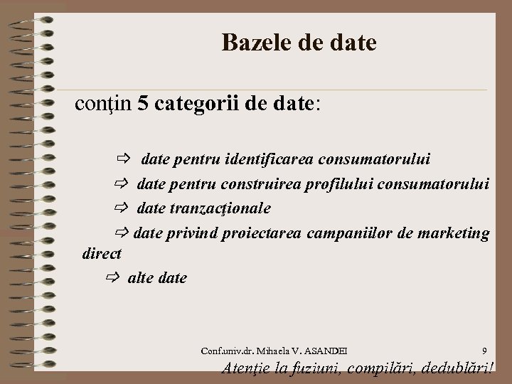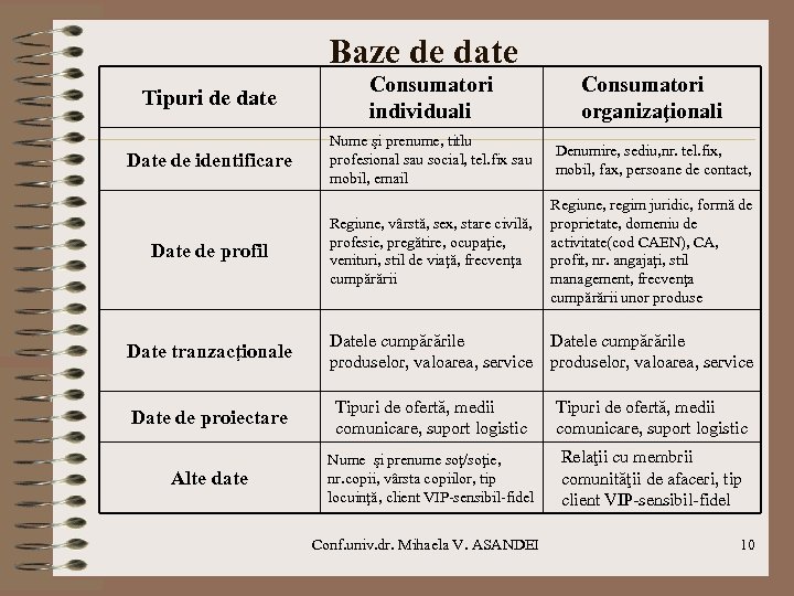 Bazele de date conţin 5 categorii de date: date pentru identificarea consumatorului date pentru construirea profilului consumatorului date tranzacţionale date privind proiectarea campaniilor de marketing direct alte date Conf. univ. dr. Mihaela V. ASANDEI 9 Atenţie la fuziuni, compilări, dedublări!