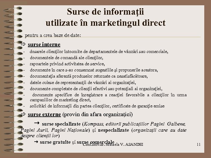 Surse de informaţii utilizate în marketingul direct pentru a crea baze de date: surse interne - dosarele clienţilor întocmite de departamentele de vânzări sau comerciale, - documentele de comandă ale clienţilor, - rapoartele privind activitatea de service, - documente în care s-au consemnat sugestiile şi propunerile acestora, - documentaţia aferentă produselor returnate ca nesatisfăcătoare, - datele culese de reprezentanţii de vânzări ai organizaţiei, - documente completate de clienţii efectivi sau potenţiali ai organizaţiei, - documente specifice de înregistrare a reacţiei favorabile a clienţilor în urma campaniilor de marketing direct, - solicitări de informaţii din partea clienţilor, certificate de garanţie emise surse externe (provin din afara organizaţiei) surse specializate (Kompass, editorii publicaţiilor Pagini Galbene, Pagini Aurii, Pagini Naţionale) şi nespecializate (organizaţii care au date despre clienţii lor) surse gratuite şi surse comerciale Conf. univ. dr. Mihaela V. ASANDEI 11