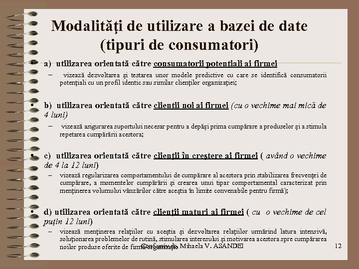 Modalităţi de utilizare a bazei de date (tipuri de consumatori) • a) utilizarea orientată către consumatorii potenţiali ai firmei – vizează dezvoltarea şi testarea unor modele predictive cu care se identifică consumatorii potenţiali cu un profil identic sau similar clienţilor organizaţiei; • b) utilizarea orientată către clienţii noi ai firmei (cu o vechime mai mică de 4 luni) – vizează asigurarea suportului necesar pentru a depăşi prima cumpărare a produselor şi a stimula repetarea cumpărării acestora; • c) utilizarea orientată către clienţii în creştere ai firmei ( având o vechime de 4 la 12 luni) – • vizează regularizarea comportamentului de cumpărare al acestora prin stabilizarea frecvenţei de cumpărare, a momentelor cumpărării şi crearea unui tipar comportamental caracterizat prin menţinerea volumului vânzărilor către aceştia în limite convenabile pentru firmă); d) utilizarea orientată către clienţii maturi ai firmei ( cu o vechime de cel puţin 12 luni) – vizează menţinerea relaţiilor cu aceştia şi dezvoltarea relaţiilor urmărind latura intensivă, soluţionarea problemelor de rutină, stimularea interesului şi motivarea acestora spre cumpărarea Conf. univ. dr. Mihaela V. ASANDEI 12 noilor produse oferite de firmă/organizaţie