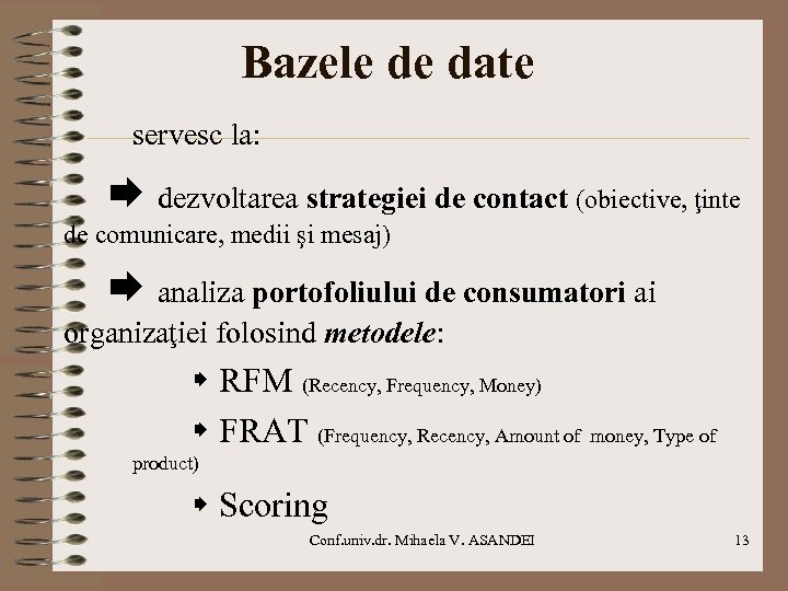 Bazele de date servesc la: dezvoltarea strategiei de contact (obiective, ţinte de comunicare, medii şi mesaj) analiza portofoliului de consumatori ai organizaţiei folosind metodele: RFM (Recency, Frequency, Money) FRAT (Frequency, Recency, Amount of money, Type of product) Scoring Conf. univ. dr. Mihaela V. ASANDEI 13