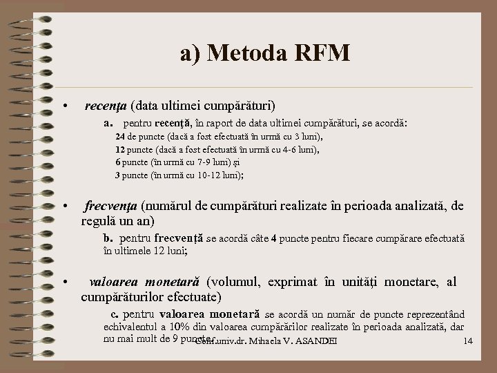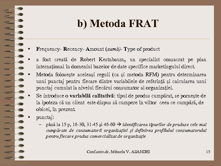 a) Metoda RFM • recenţa (data ultimei cumpărături) a. pentru recenţă, în raport de data ultimei cumpărături, se acordă: 24 de puncte (dacă a fost efectuată în urmă cu 3 luni), 12 puncte (dacă a fost efectuată în urmă cu 4 -6 luni), 6 puncte (în urmă cu 7 -9 luni) şi 3 puncte (în urmă cu 10 -12 luni); • frecvenţa (numărul de cumpărături realizate în perioada analizată, de regulă un an) b. pentru frecvenţă se acordă câte 4 puncte pentru fiecare cumpărare efectuată în ultimele 12 luni; • valoarea monetară (volumul, exprimat în unităţi monetare, al cumpărăturilor efectuate) c. pentru valoarea monetară se acordă un număr de puncte reprezentând echivalentul a 10% din valoarea cumpărărilor realizate în perioada analizată, dar nu mai mult de 9 puncte. Conf. univ. dr. Mihaela V. ASANDEI 14