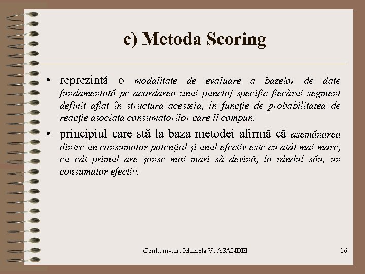 c) Metoda Scoring • reprezintă o modalitate de evaluare a bazelor de date fundamentată pe acordarea unui punctaj specific fiecărui segment definit aflat în structura acesteia, în funcţie de probabilitatea de reacţie asociată consumatorilor care îl compun. • principiul care stă la baza metodei afirmă că asemănarea dintre un consumator potenţial şi unul efectiv este cu atât mai mare, cu cât primul are şanse mai mari să devină, la rândul său, un consumator efectiv. Conf. univ. dr. Mihaela V. ASANDEI 16