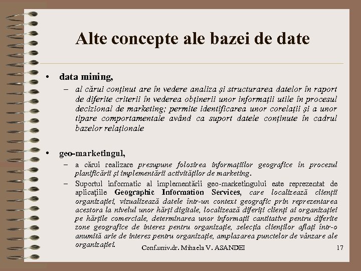 Alte concepte ale bazei de date • data mining, – al cărui conţinut are în vedere analiza şi structurarea datelor în raport de diferite criterii în vederea obţinerii unor informaţii utile în procesul decizional de marketing; permite identificarea unor corelaţii şi a unor tipare comportamentale având ca suport datele conţinute în cadrul bazelor relaţionale • geo-marketingul, – a cărui realizare presupune folosirea informaţiilor geografice în procesul planificării şi implementării activităţilor de marketing. – Suportul informatic al implementării geo-marketingului este reprezentat de aplicaţiile Geographic Information Services, care localizează clienţii organizaţiei, vizualizează datele într-un context geografic prin reprezentarea acestora la nivelul unor hărţi digitale, localizează diferiţi clienţi ai organizaţiei pe hărţile comerciale, determinarea unor informaţii cantitative pentru diferite zone geografice de interes pentru organizaţie, selecţia clienţilor aflaţi într-o anumită arie de interes pentru organizaţie, amplasarea punctelor de vânzare ale organizaţiei. Conf. univ. dr. Mihaela V. ASANDEI 17