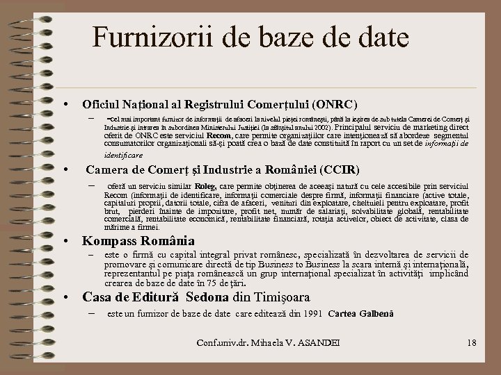 Furnizorii de baze de date • Oficiul Naţional al Registrului Comerţului (ONRC) – -cel mai important furnizor de informaţii de afaceri la nivelul pieţei româneşti, până la ieşirea de sub tutela Camerei de Comerţ şi Industrie şi intrarea în subordinea Ministerului Justiţiei (la sfârşitul anului 2002). Principalul serviciu de marketing direct oferit de ONRC este serviciul Recom, care permite organizaţiilor care intenţionează să abordeze segmentul consumatorilor organizaţionali să-şi poată crea o bază de date constituită în raport cu un set de informaţii de identificare • Camera de Comerţ şi Industrie a României (CCIR) – oferă un serviciu similar Roleg, care permite obţinerea de aceeaşi natură cu cele accesibile prin serviciul Recom (informaţii de identificare, informaţii comerciale despre firmă, informaţii financiare (active totale, capitaluri proprii, datorii totale, cifra de afaceri, venituri din exploatare, cheltuieli pentru exploatare, profit brut, pierderi înainte de impozitare, profit net, număr de salariaţi, solvabilitate globală, rentabilitate comercială, rentabilitate economică, rentabilitate financiară, rotaţia activelor, obiect de activitate, clasa de mărime a firmei. • Kompass România – este o firmă cu capital integral privat românesc, specializată în dezvoltarea de servicii de promovare şi comunicare directă de tip Business to Business la scara internă şi internaţională, reprezentantul pe piaţa românească un grup internaţional specializat în activităţi implicând crearea de baze de date în 75 de ţări. • Casa de Editură Sedona din Timişoara – este un furnizor de baze de date care editează din 1991 Cartea Galbenă Conf. univ. dr. Mihaela V. ASANDEI 18
